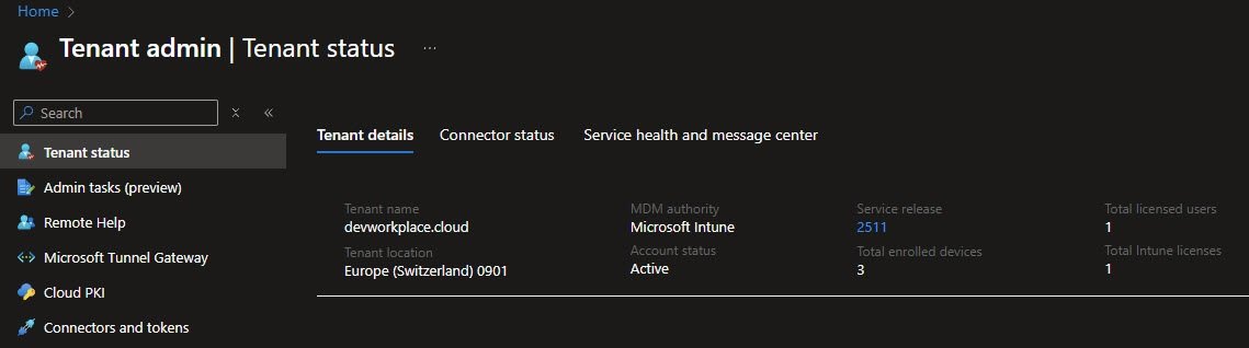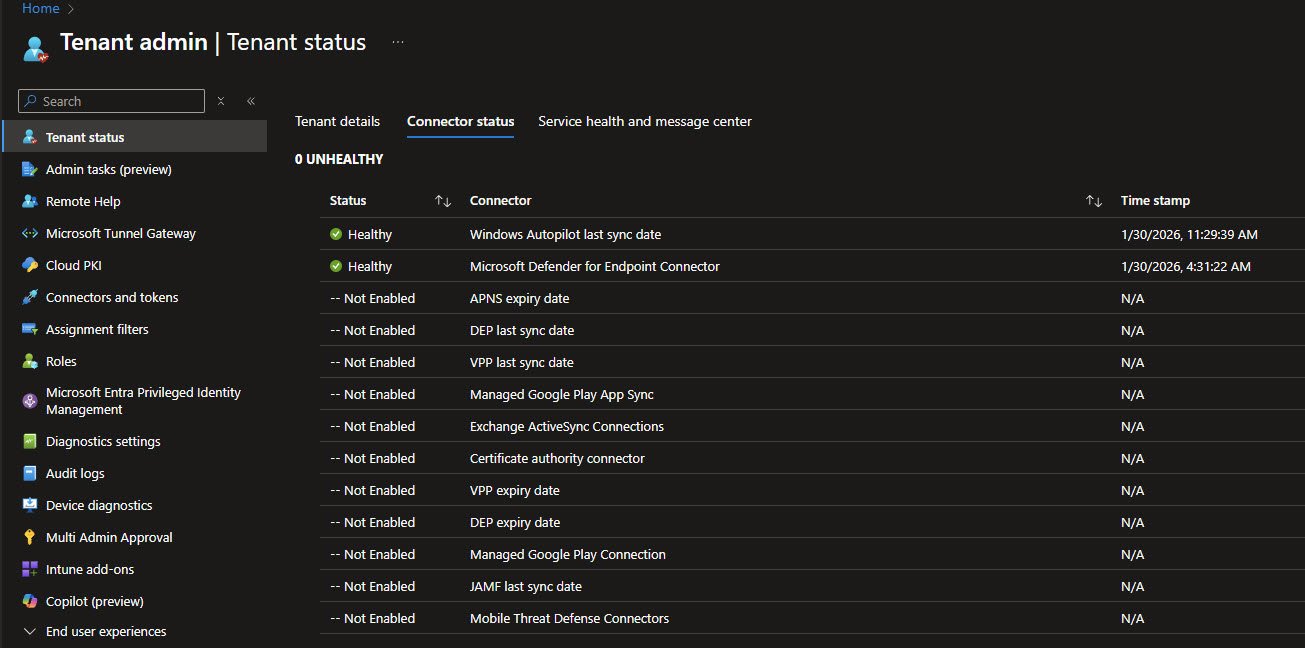 Before looking at device policies and configurations, it helps to start with the health of the Intune tenant itself. The Tenant Admin | Tenant Status blade in the Intune admin center provides a quick snapshot of the foundation the rest of the configuration depends on.