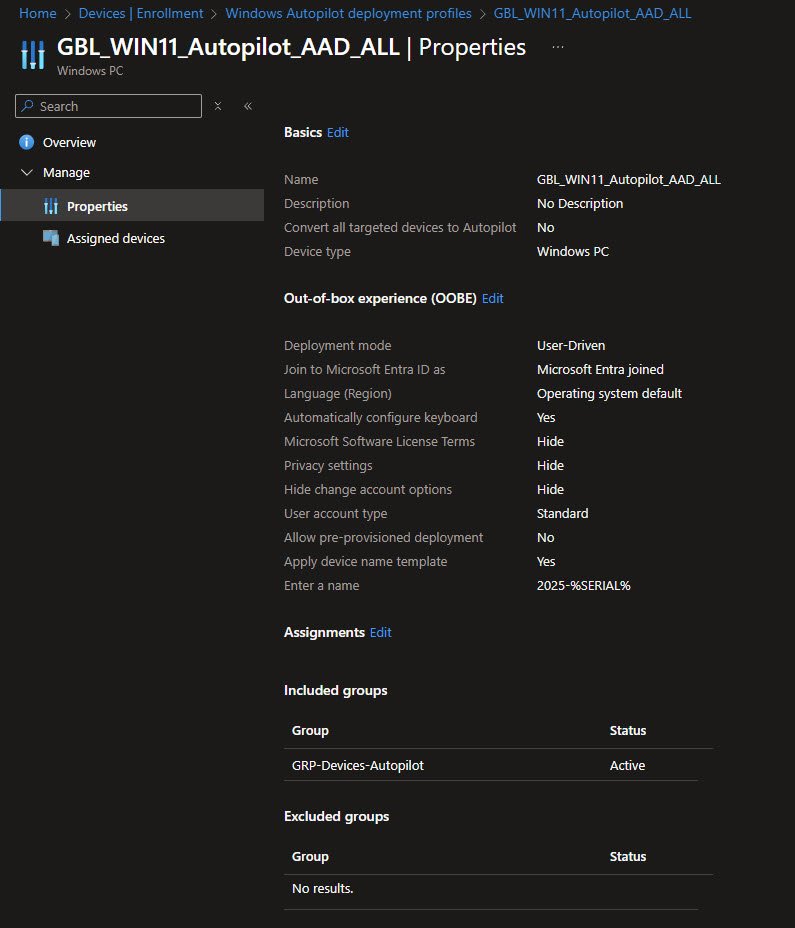 My custom GBL_WIN11_Autopilot_AAD_ALL deployment profile defines how Windows devices behave during the Out of Box Experience when they are provisioned through Autopilot.