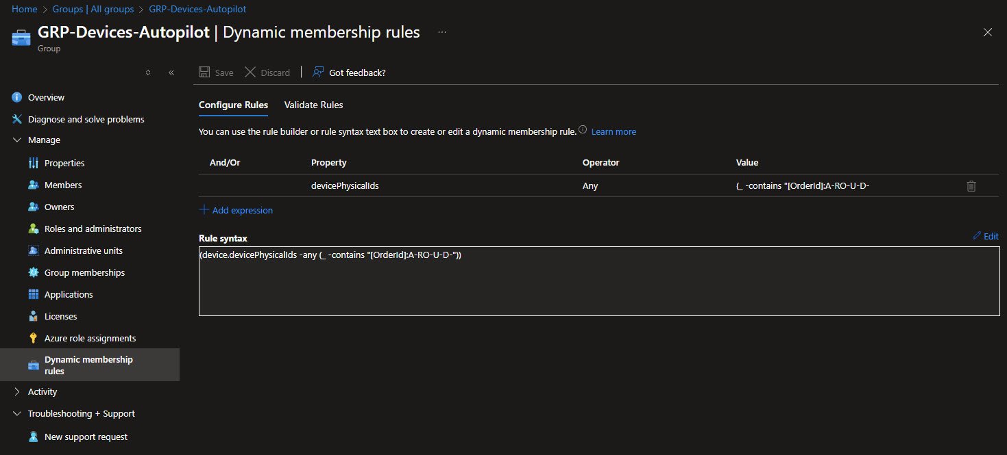 This group relies on an Autopilot GroupTag strategy, when a device is registered in Autopilot it is assigned a GroupTag value. That value is stored in Microsoft Entra ID as part of the device physical identifiers exposed through the devicePhysicalIds attribute.