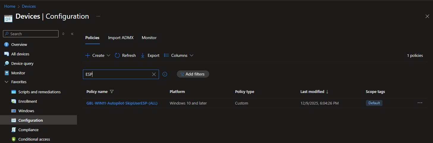 The GBL-WIN11-Autopilot-SkipUserESP-(ALL) policy exists to solve a very specific Autopilot annoyance: the User ESP phase often adds time and unpredictability without providing much value once the device side of provisioning is already complete.