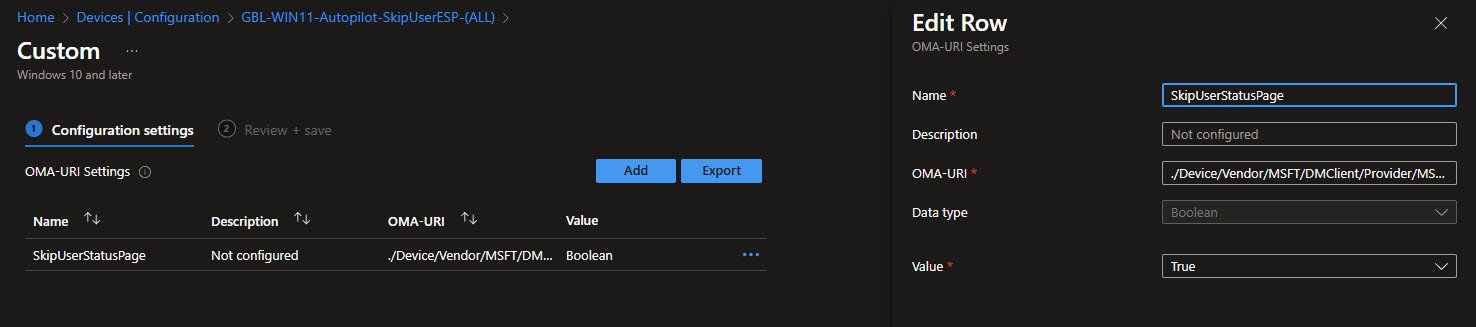 This policy uses a custom OMA-URI setting to explicitly skip the User ESP phase. The configuration sets SkipUserStatusPage to True: