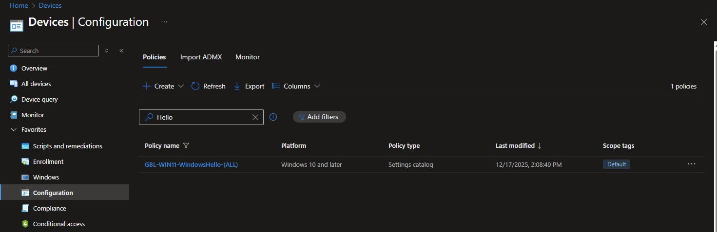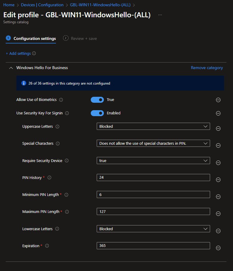 The GBL-WIN11-WindowsHello-(ALL) policy configures Windows Hello for Business using the Settings Catalog. This reflects the current Microsoft recommended approach and makes the policy easier to maintain and extend over time.