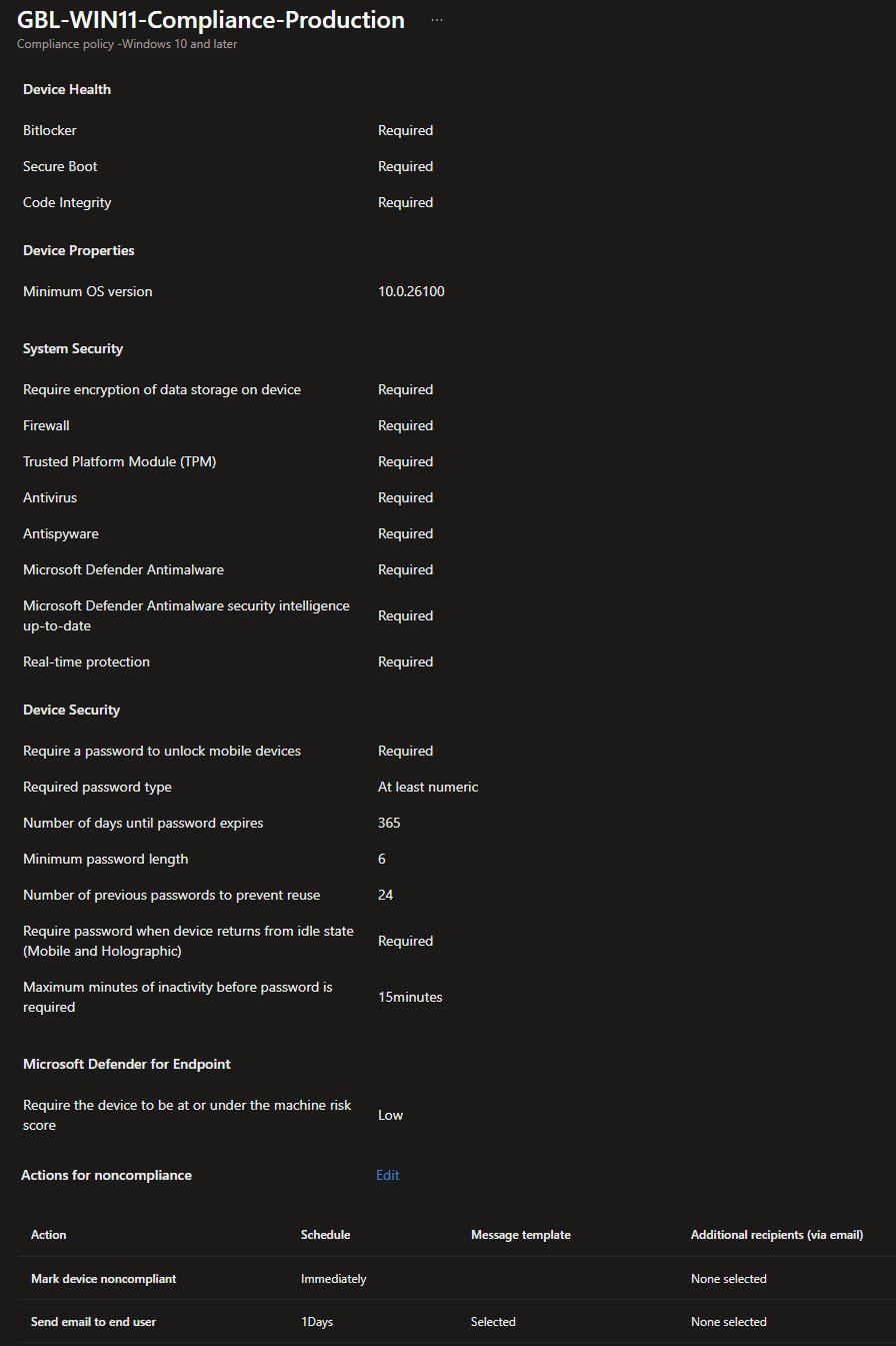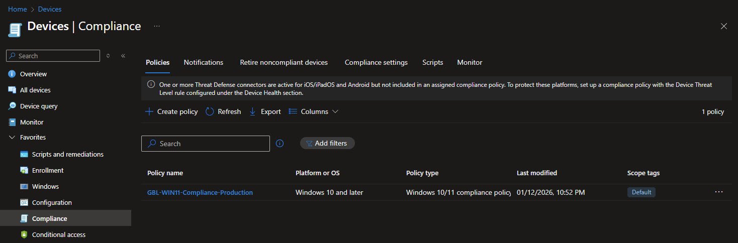 The GBL-WIN11-Compliance-Production policy defines the baseline compliance requirements for Windows 11 devices. It is created as a Windows 10/11 compliance policy and targets Windows devices consistently across the environment.