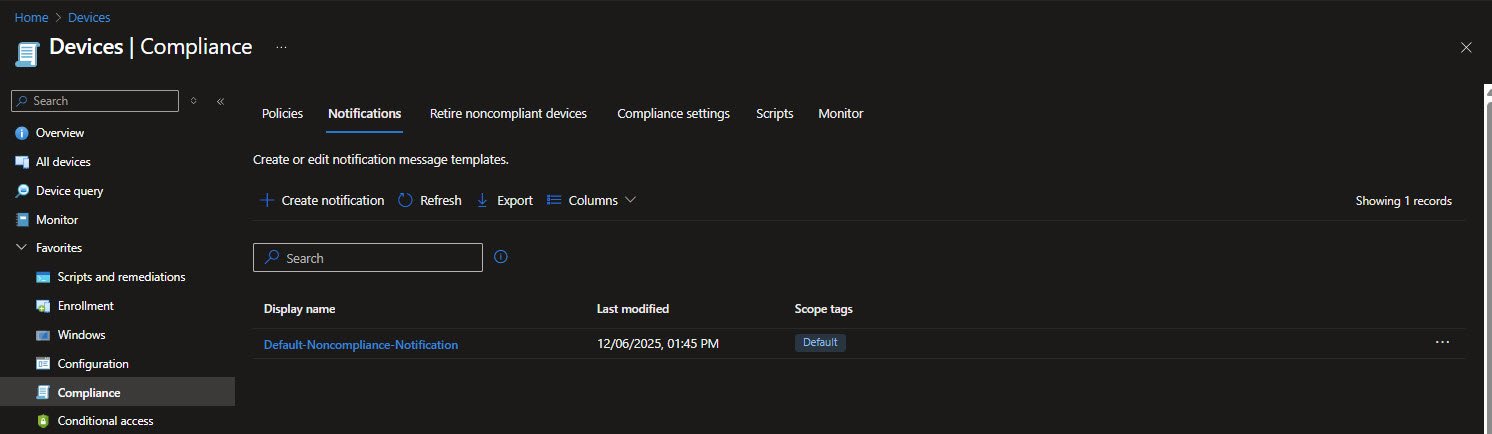 Non-compliance handling is intentionally simple and visible as soon as a device falls out of compliance, it is marked non-compliant immediately. End user notification is delayed by one day, avoiding spamming users for short-lived conditions such as a pending reboot, a Defender definition update or Windows Updates still finishing in the background. If the device remains non-compliant after 24 hours the user receives a clear and actionable email.