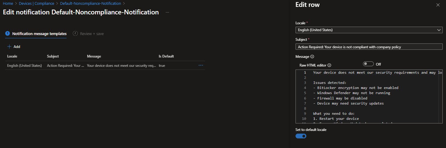 The notification template is explicit about what typically causes non-compliance in my environment: BitLocker not enabled, Defender or Firewall not running or missing security updates. It also gives concrete steps the user can take on their own before escalating to IT, such as restarting the device and completing Windows Update.