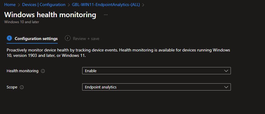 This is the configuration profile that actually deploys to devices to enable health monitoring. The profile itself is straightforward with just two settings: Health monitoring set to Enable and Scope set to Endpoint analytics. This profile was auto-created when Endpoint Analytics was first accessed which I’ve also manually renamed to GBL-WIN11-EndpointAnalytics-(ALL) to align with my naming standards convention: