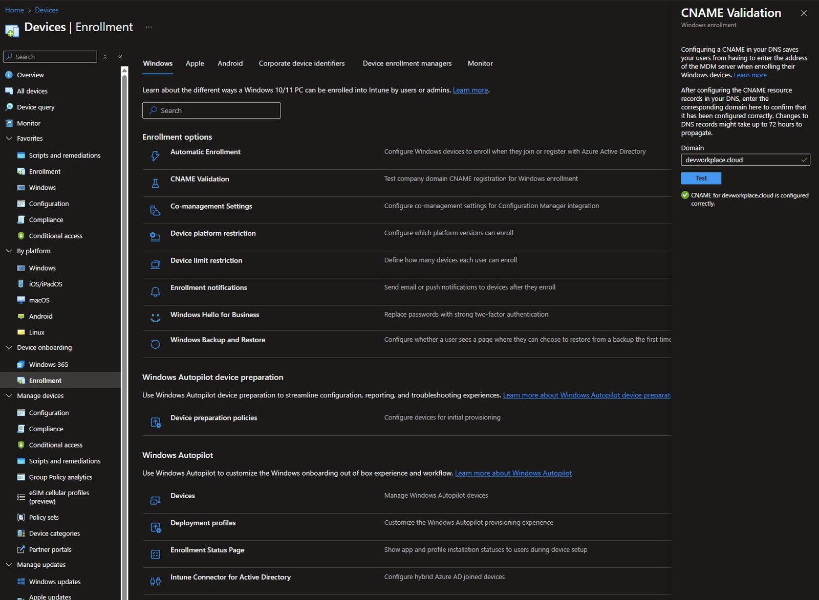 The Devices | Enrollment blade is the central hub for everything related to getting devices into Intune with various enrollment options available.