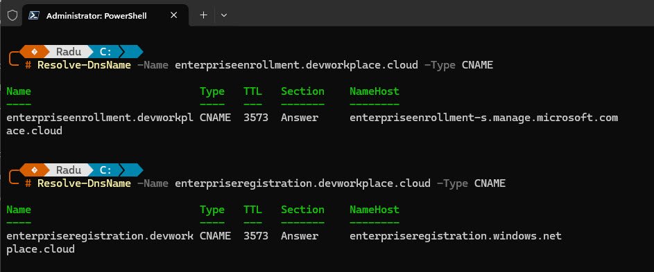 Both records can also be verified from the command line, the enterpriseenrollment record points to the Intune MDM enrollment endpoint while enterpriseregistration handles Azure AD device registration: