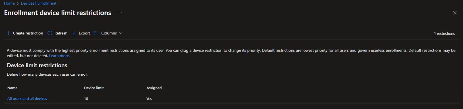 Device limit restrictions control how many devices each user can enroll in Intune. The default policy “All users and all devices” allows up to 10 devices per user which is usually sufficient for most scenarios.