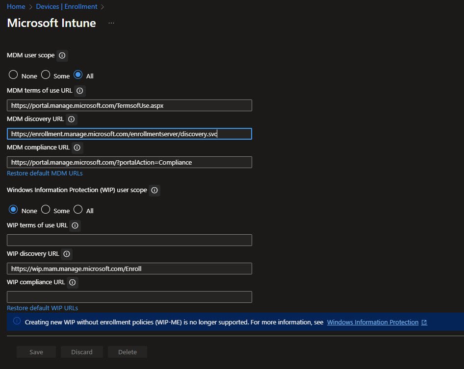 The three URLs from the screenshot below are the endpoints that Windows uses during enrollment, Microsoft’s default URLs and rarely need modification. The MDM terms of use URL points to a generic terms page, the discovery URL is how devices find the enrollment server and the compliance URL is where devices check their compliance status.