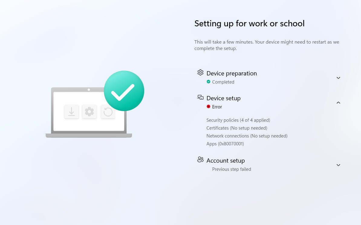 The Enrollment Status Page (ESP) has failed, device preparation completed successfully but Device Setup shows an error. The Apps category reports error code 0x80070001 and Account setup was never reached, displaying “Previous step failed.”