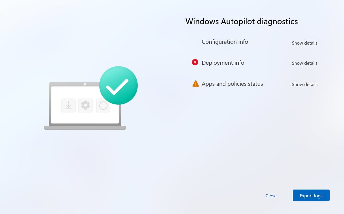 Before touching any logs (Export logs) just press Ctrl+Shift+D on the failed ESP screen which opens the built-in Windows Autopilot diagnostics page, showing Configuration info, Deployment info and Apps and policies status: