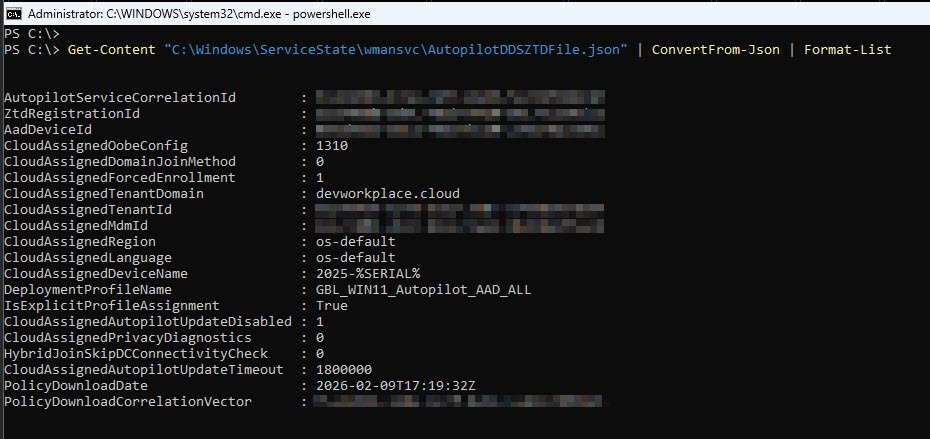 The Autopilot profile is stored in a file called AutopilotDDSZTDFile.json, the file path varies depending on the Windows version, on older builds it was located under C:\Windows\ServiceState\Autopilot, but on Windows 11 25H2 the path has changed to C:\Windows\ServiceState\wmansvc so rather than guessing, you can use this recursive search which will find it regardless of OS version: