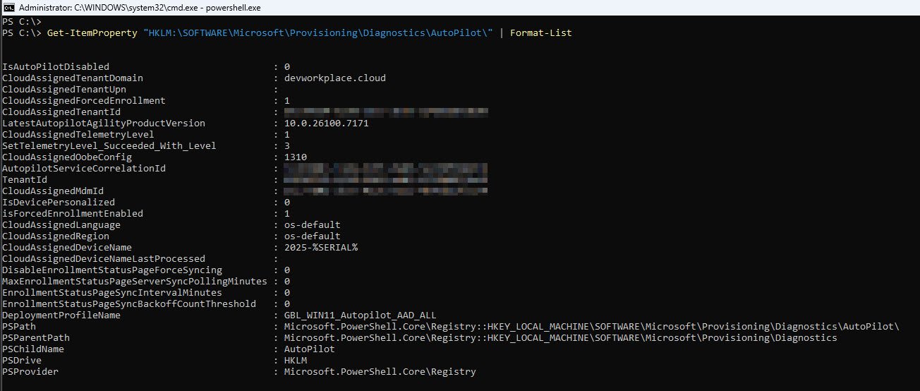 Get-ItemProperty "HKLM:\SOFTWARE\Microsoft\Provisioning\Diagnostics\AutoPilot" | Format-List