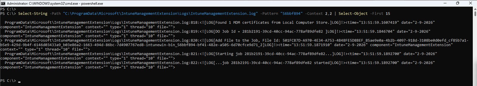 Select-String is PowerShell’s equivalent of grep, it searches a text file for lines matching a pattern and returns the matches with surrounding context, in this case the -Pattern “56bbf894” targets our failed app’s GUID.