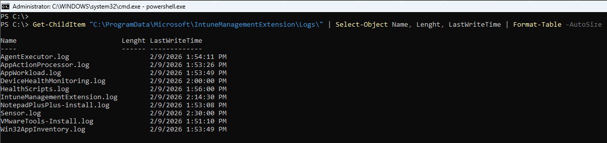 Get-ChildItem "C:\ProgramData\Microsoft\IntuneManagementExtension\Logs\" | Select-Object Name, Length, LastWriteTime | Format-Table -AutoSize