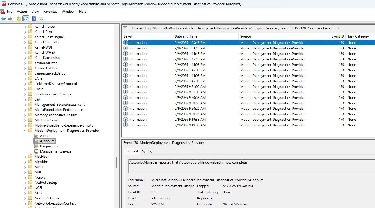 Navigate to Applications and Services Logs -> Microsoft -> Windows -> ModernDeployment-Diagnostics-Provider -> Autopilot because this is where Windows records Autopilot specific provisioning events. The log will contain a mix of informational events and the volume can be noisy so rather than scrolling through everything, right-click the log and select Filter Current Log and manually enter 153,170 in the Event IDs field, these are the two events that confirm whether the Autopilot profile was successfully downloaded and activated.