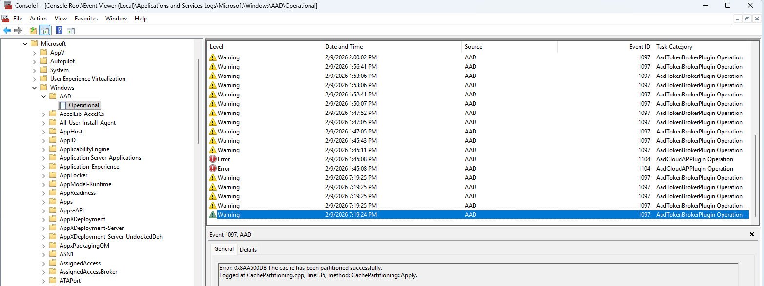 In Applications and Services Logs -> Microsoft -> Windows -> AAD -> Operational, two event types stand out immediately because they are flagged as warnings and errors: