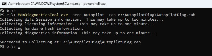 MdmDiagnosticsTool.exe -area Autopilot -cab E:\AutopilotDiag\AutopilotDiag.cab