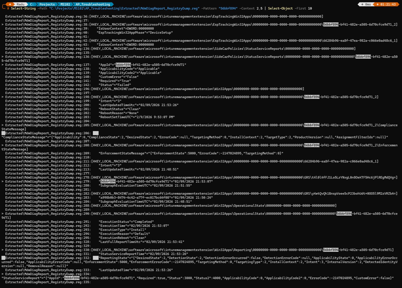 To search the registry dump for our failed app, use Select-String with the App GUID we’ve identified back in Step 1:
