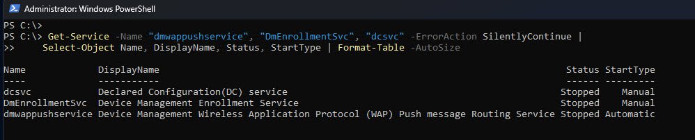 Get-Service -Name "dmwappushservice", "DmEnrollmentSvc", "dcsvc" -ErrorAction SilentlyContinue |
