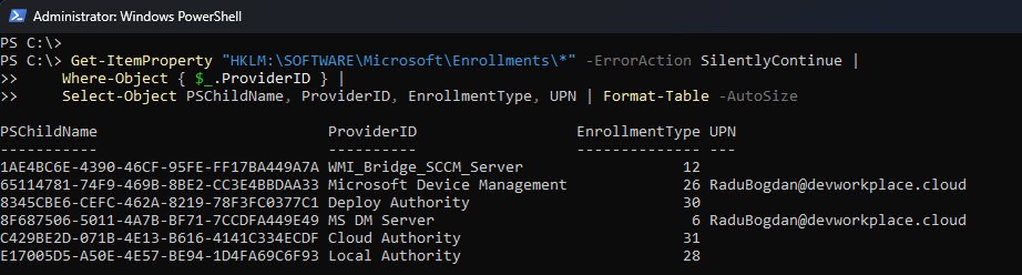 Get-ItemProperty "HKLM:\SOFTWARE\Microsoft\Enrollments\*" -ErrorAction SilentlyContinue |