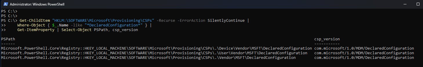 DeclaredConfiguration is a modern MDM CSP that isn’t always visible in the registry. Even if HKLM:\SOFTWARE\Microsoft\Provisioning\CSPs shows nothing, the CSP can still be fully supported and functional.