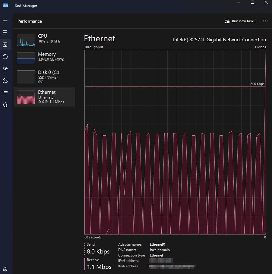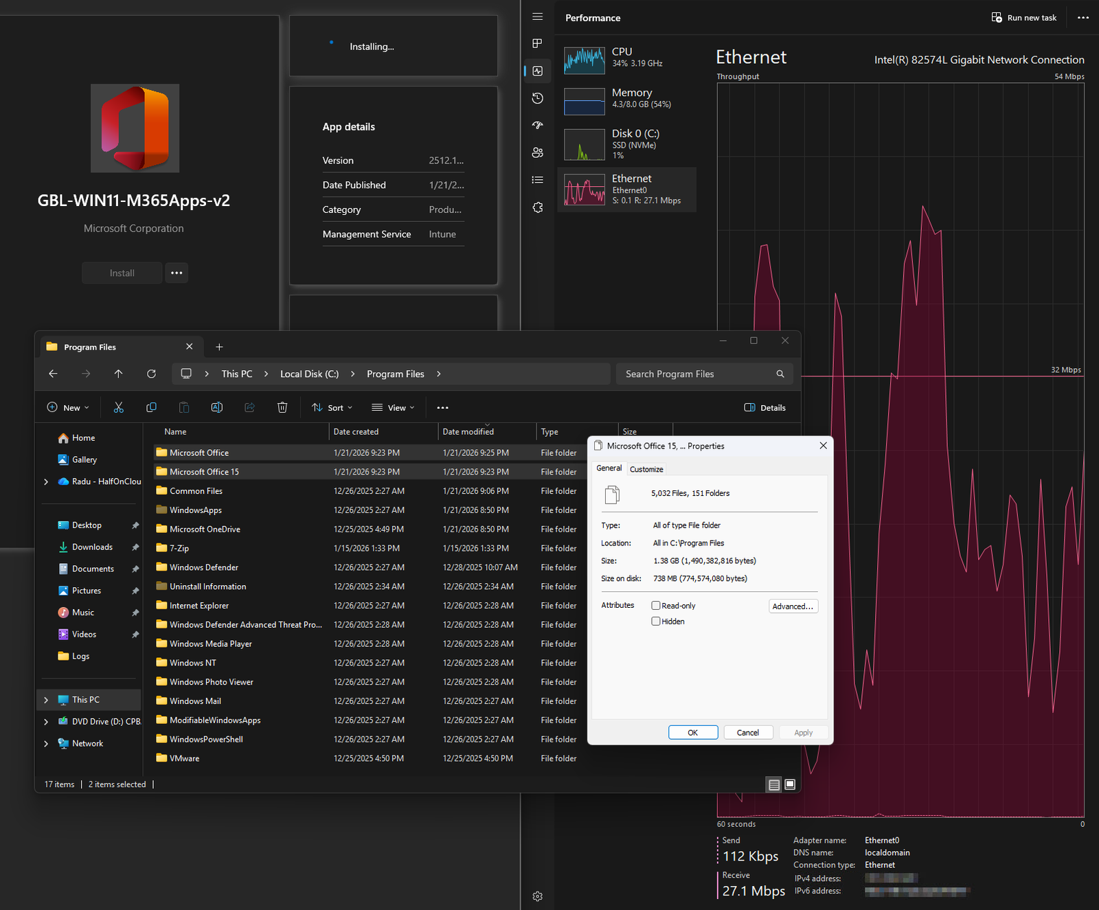 At this point, Task Manager revealed the real issue. Despite a Gigabit network adapter, network throughput was capped at approximately 1.1 Mbps showing constant throttling spikes. At this speed downloading ~4 GB of Office content would take 25–38 hours which is obviously unacceptable for production or Autopilot deployments.