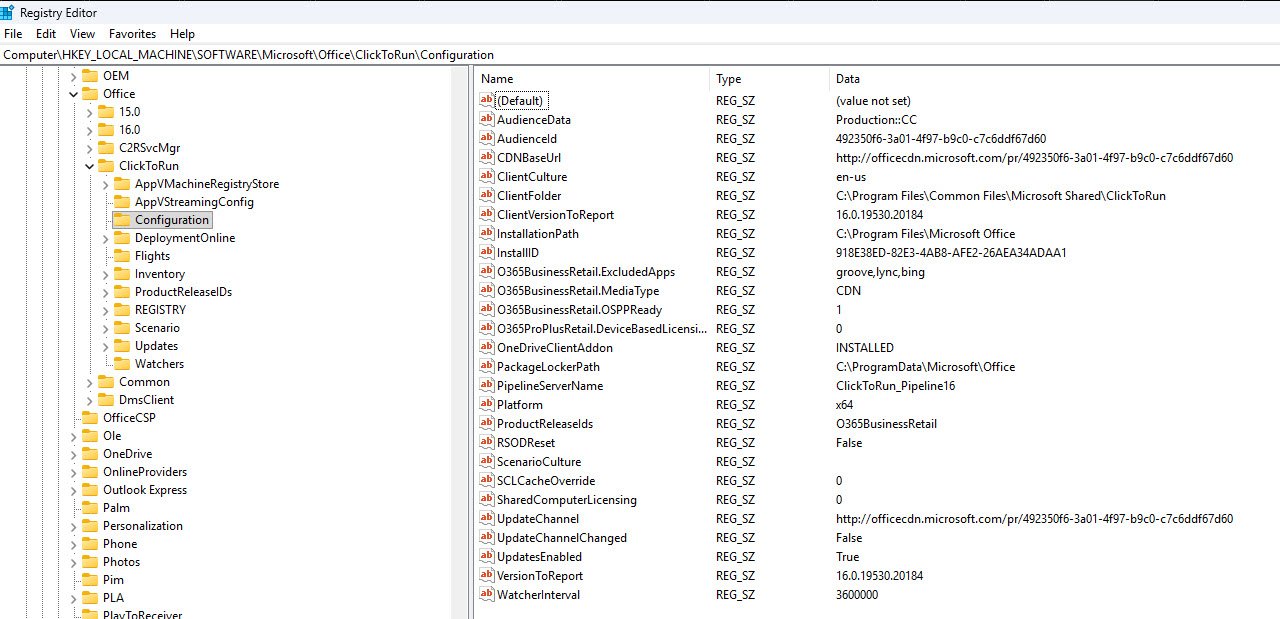 HKEY_LOCAL_MACHINE\SOFTWARE\Microsoft\Office\ClickToRun\Configuration