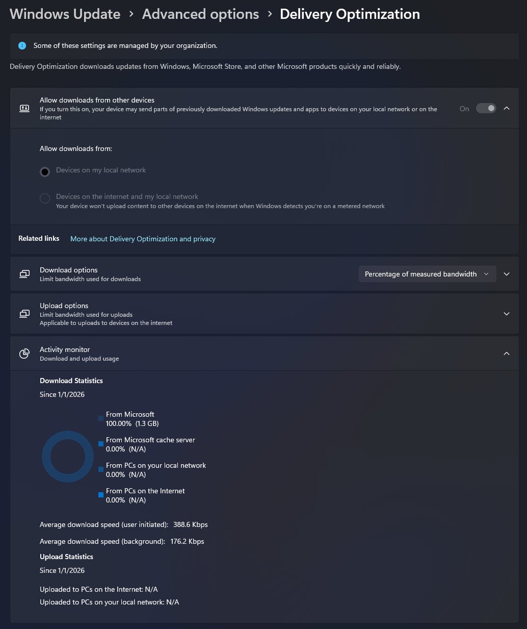 These values are particularly important since they demonstrate that Windows is dynamically calculating bandwidth usage rather than being constrained by static, policy-enforced percentage limits. This behavior only becomes possible after removing explicit foreground and background bandwidth caps from the Intune Delivery Optimization policy.