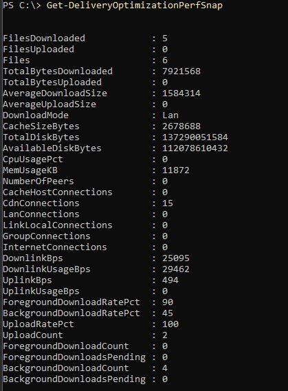 The PowerShell command Get-DeliveryOptimizationPerfSnap provides a runtime snapshot of Delivery Optimization behavior and effective settings: