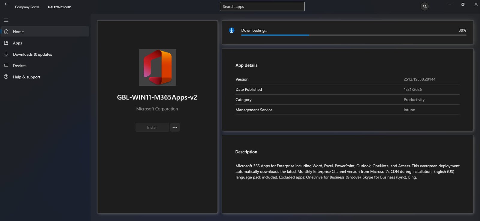 The Company Portal displays the deployment progress of GBL-WIN11-M365Apps-v2: