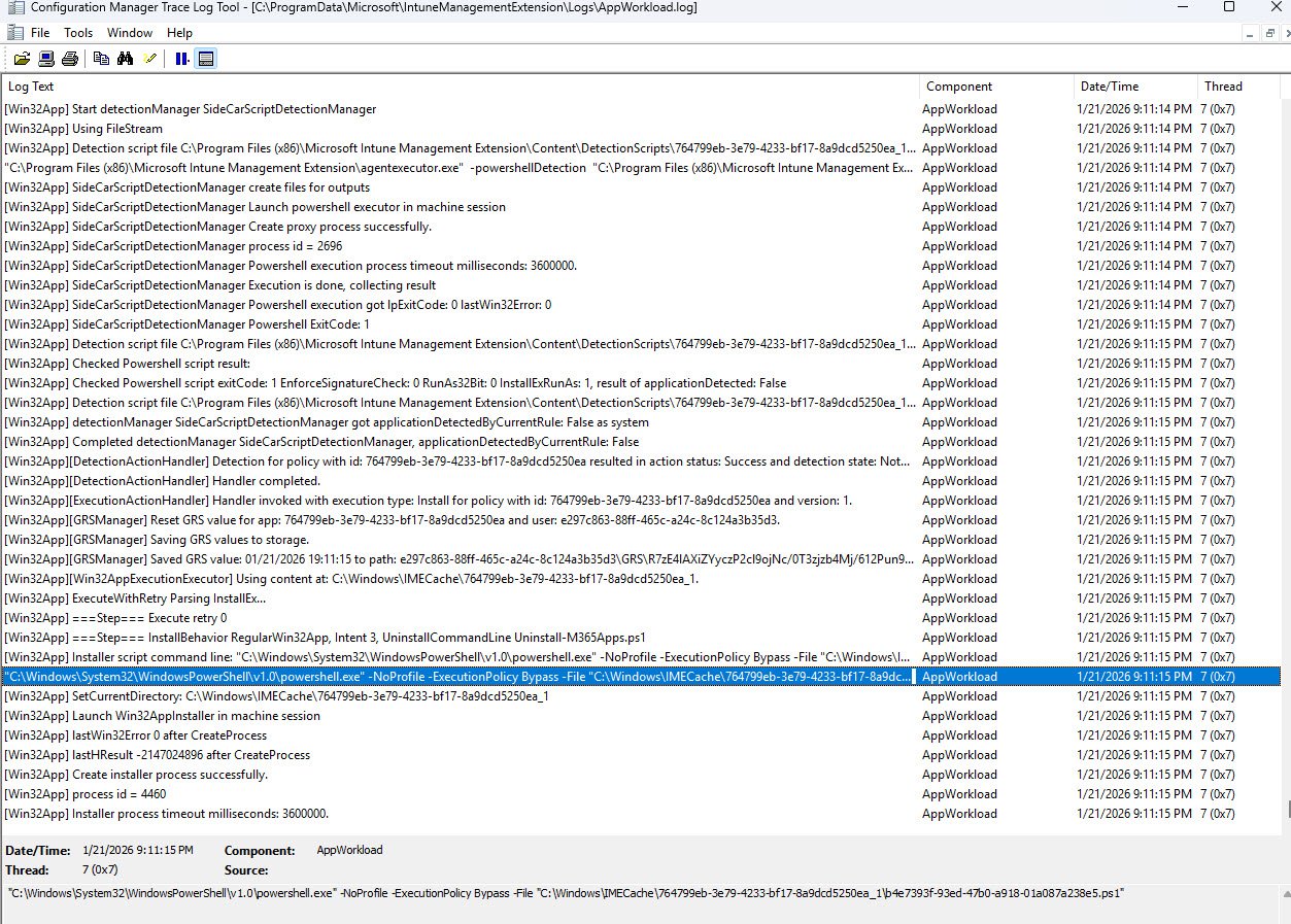 The log “AppWorkload.log” shows the detection script returning applicationDetected: False, followed by the execution handler launching the install. The highlighted line confirms the PowerShell installer is executed from the IMECache folder, which is expected behavior for Win32 apps: