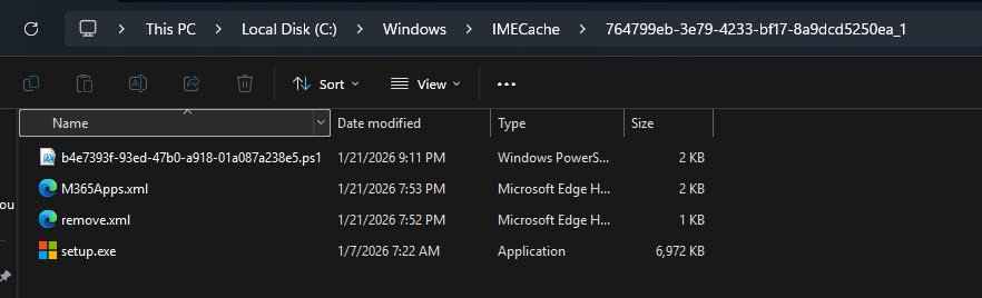 The “C:\Windows\IMECache” folder shows the extracted contents of the M365 Apps Win32 package with the unique app GUID folder name. The contents include the install script (renamed with a GUID prefix) along with the other three files addressed above: M365Apps.xml, remove.xml and setup.exe.