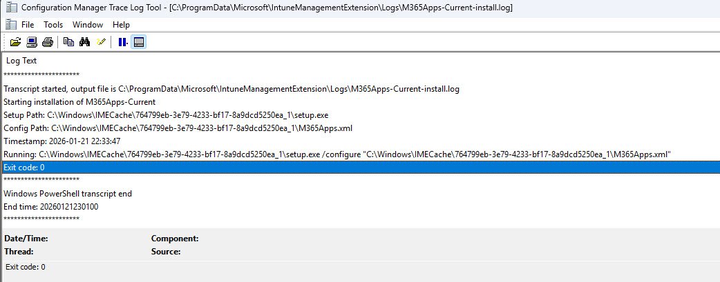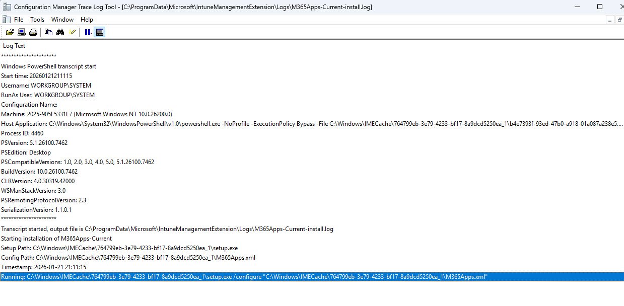 The output for the custom log “M365Apps-Current-install.log“is capturing the installation process, the highlighted line showing the setup.exe command being executed: setup.exe /configure “M365Apps.xml”.