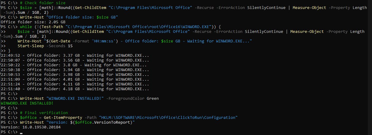 After adjusting the Delivery Optimization settings, I’ve used the following monitoring PS script which showed Office folder growth from 2.05 GB to 4.18 GB in under 2 minutes, followed by confirmation that WINWORD.EXE was installed.