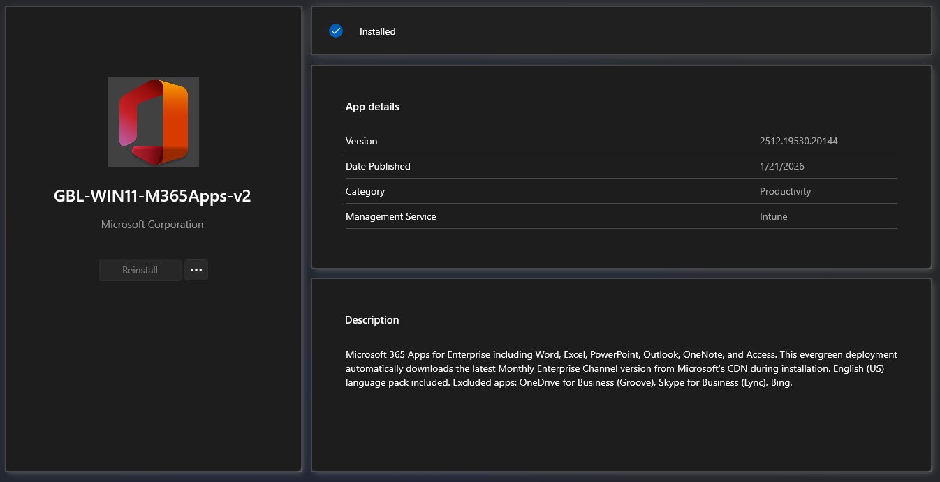 This deployment combines several moving parts: the Office Deployment Tool with a CDN-based configuration, a couple PowerShell scripts for install & uninstall as well as a separate custom detection logic with detailed logging and critically the Delivery Optimization settings that can make or break large app deployments during either regular installations (or Autopilot deployments).
