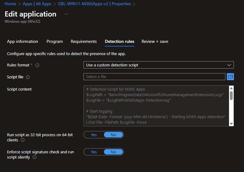 Using a custom detection script instead of a basic file or registry check provides clear detection logic, troubleshooting visibility and confirmation that Office is fully installed and usable: